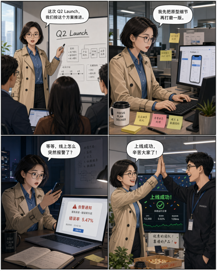 第一格:她在晨会里介绍方案,白板上写“Q2 Launch”