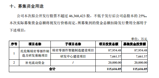 不难看出,公司在短期内完成大额外部融资后,迅速推进IPO再融资计划,本次拟募集资金115616.05万元,分别投向精密零部件制造及研发基地项目,同时安排部分资金补充流动资金,具体如下: