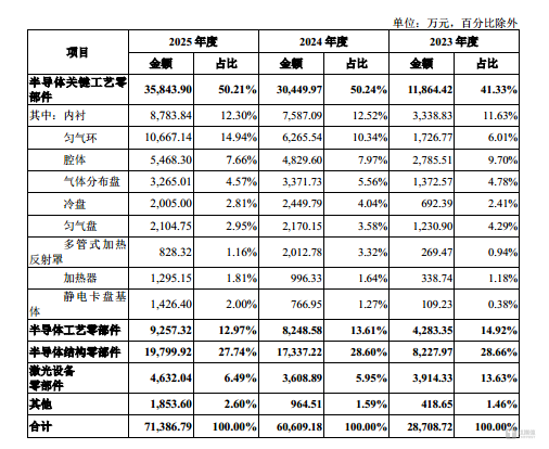 其中,半导体关键工艺零部件为公司第一大核心产品,报告期内销售收入分别达11864.42万元、30449.97万元、35843.9万元,占当期主营业务收入比重依次为41.33%、50.24%、50.21%,营收规模持续扩容,是拉动公司收入增长的主要动力。