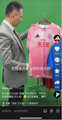 (詹俊在展示苏超各队的新款阿迪球衣)