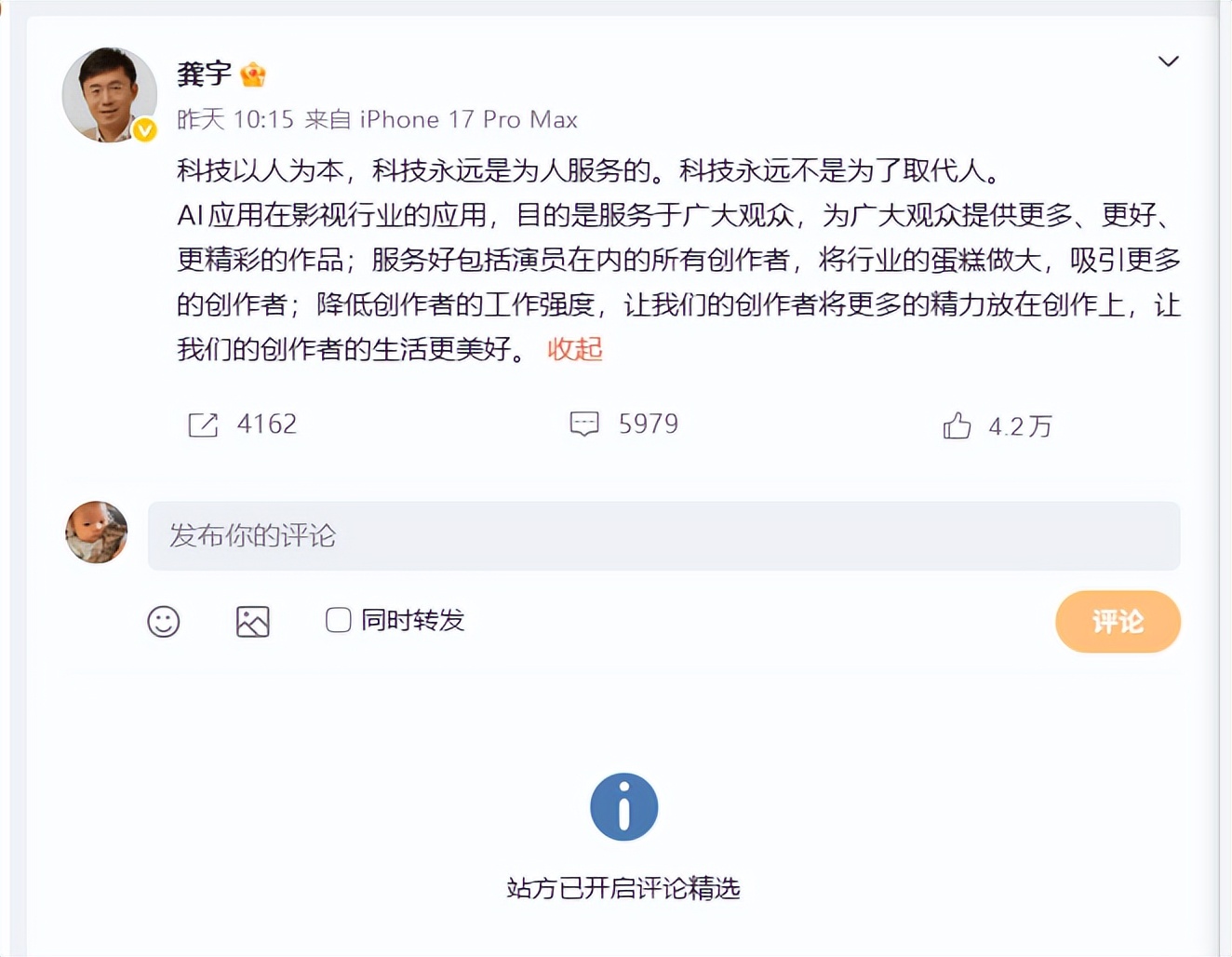 舆论风波后,龚宇连发三条微博,大意是AI剧不是为了取代人,而是为了服务人。不过眼下, 这三条微博已经开启了评论精选。