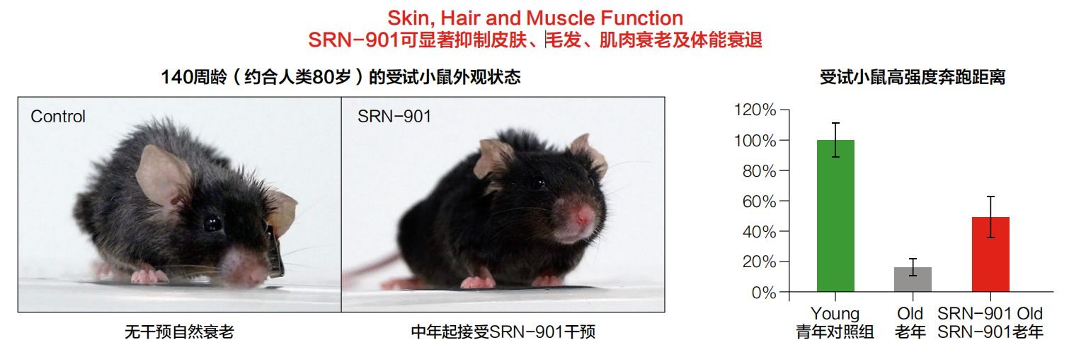 与此同时,140周龄(对应人类80岁)的干预组小鼠,皮肤紧致、毛发浓密黑亮,高强度奔跑能力从不足青年期的20%恢复至50%,生理状态显著年轻化。