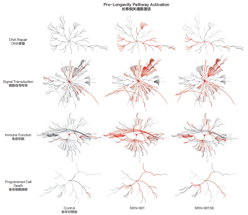 赛诺根自2018年起,联合哈佛大学、梅奥医学中心等全球顶尖机构,整合P13K/AKT/mTOR通路抑制、细胞及线粒体自噬激活、Senolytics衰老细胞靶向清除、NAD+提升等前沿核心技术,打造出多靶点协同干预分子SRN-901。
