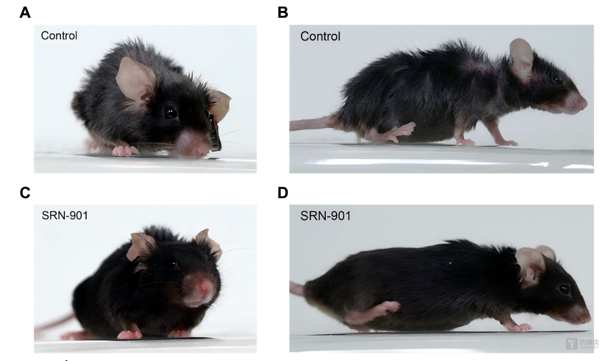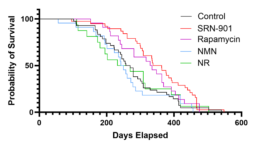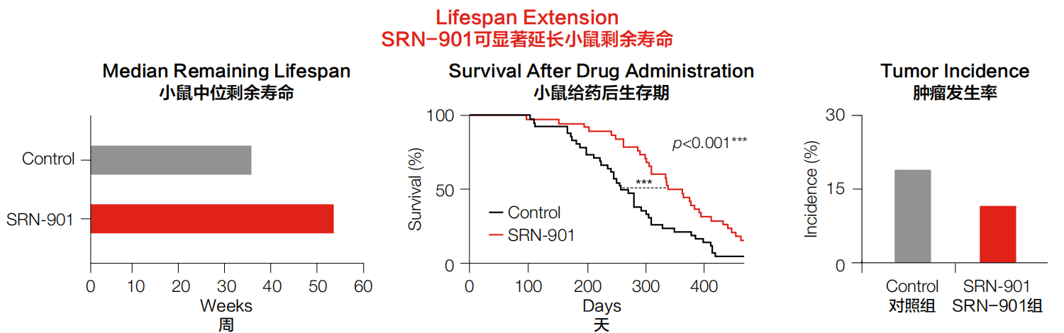 最终临床前数据显示,SRN-901干预组小鼠中位剩余寿命提升33%,远超雷帕霉素21%的延寿纪录;衰老速度放缓70%,肿瘤发生率降低30%,死亡风险下降46%。
