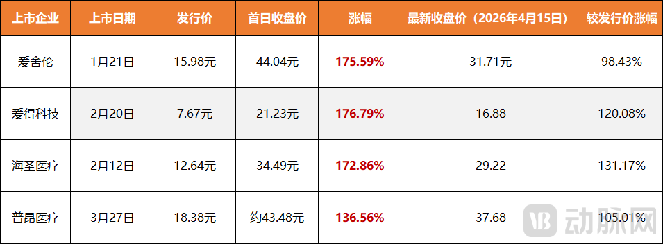 这并非昙花一现,目前4家上市企业的股价相比于发行价仍然有超过100%的涨幅,以最早上市的爱舍伦为例,截至2026年4月14日收盘,其股价为31.71元,较15.98元的发行价涨幅98.4%。这意味着,4家上市企业已成功实现了从一级市场到二级市场的价值跃升,并获得了可观的现金流支持。
