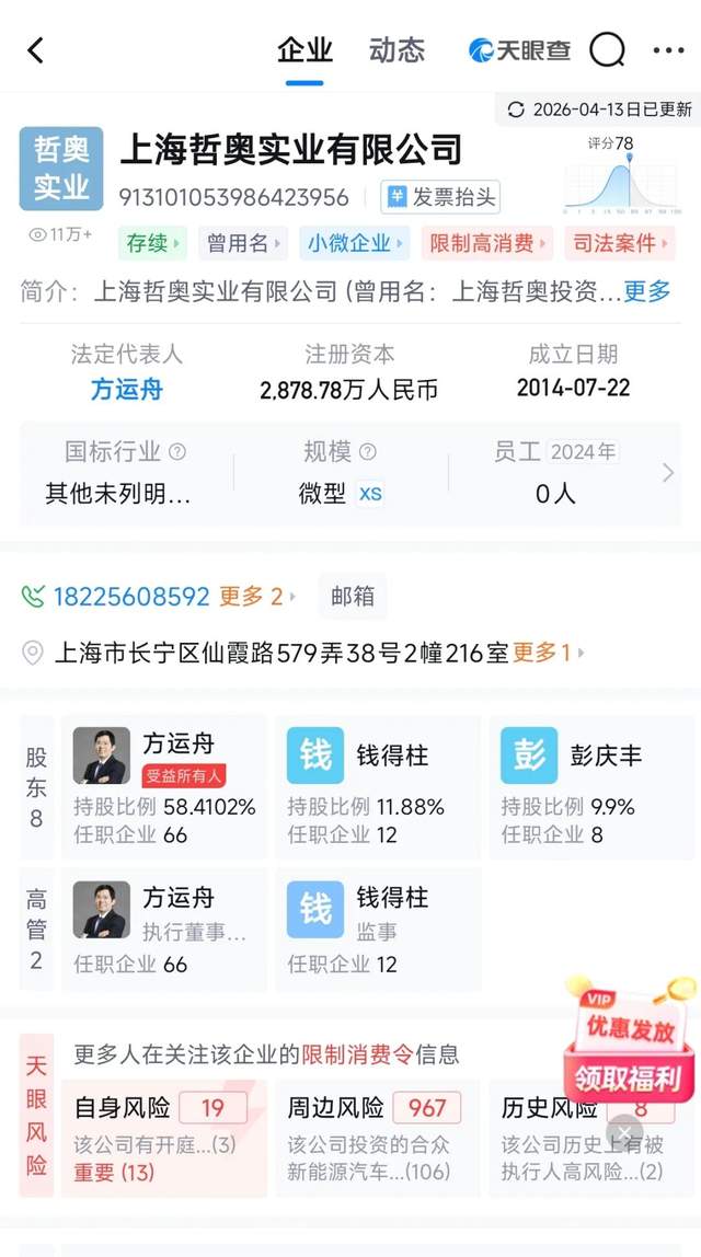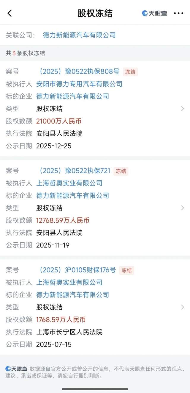 最新消息显示,德力新能源汽车有限公司法定代表人钱得柱,同样被限制高消费。且方运舟通过上海哲奥实业所持有的德力新能源汽车有限公司近1.5亿股权,也在2025年7月以及11月被两地法院执行冻结。