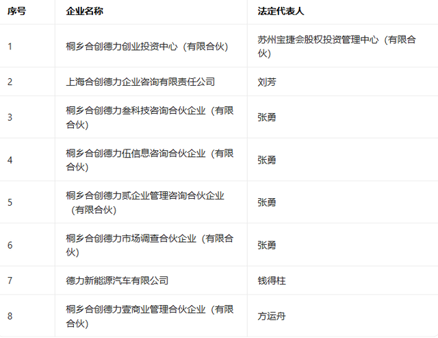 张勇则通过桐乡合创德力叁科技咨询合伙企业(有限合伙)、桐乡合创德力伍信息咨询合伙企业(有限合伙),参与投资了德力新能源汽车有限公司。