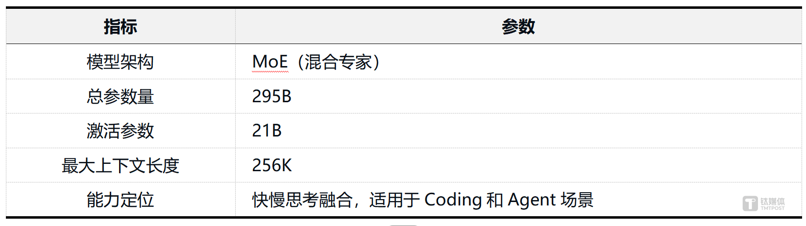 在国内大模型竞争格局中,混元本次的定位可以概括为:“不做第一,但求好用”。从参数规模看,295B总参/21B激活参数定位于中等尺寸区间,与“大杯”产品存在差异,但规模控制带来了更好的推理效率。