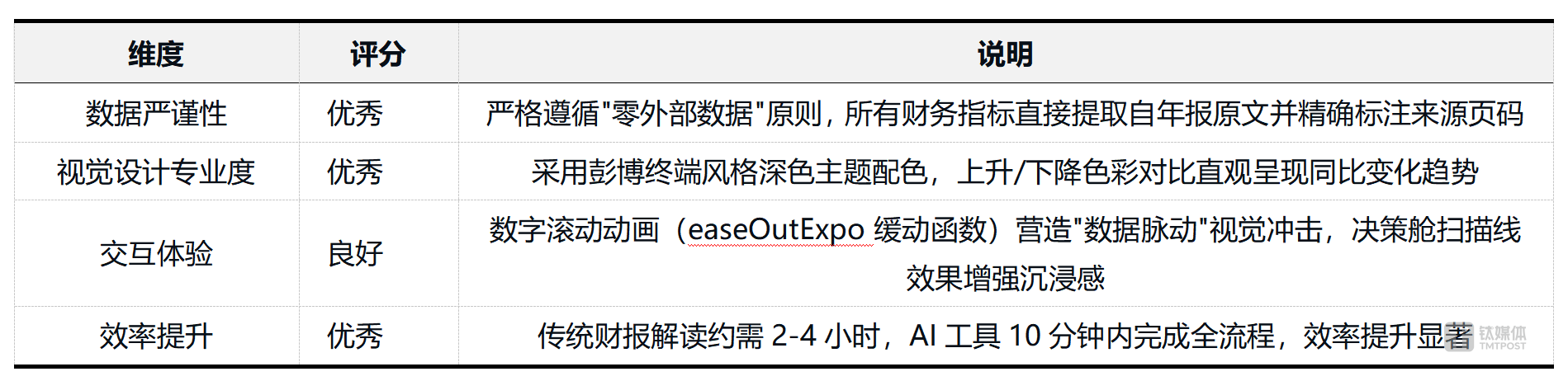 结论:AI辅助财经内容生产正从“文本生成”向“数据可视化自动化”进阶。该工具在数据处理、视觉呈现、交互设计三个层面的完成度已达到可发布至财经媒体报道的合格线。推荐指数4.5/5.0。