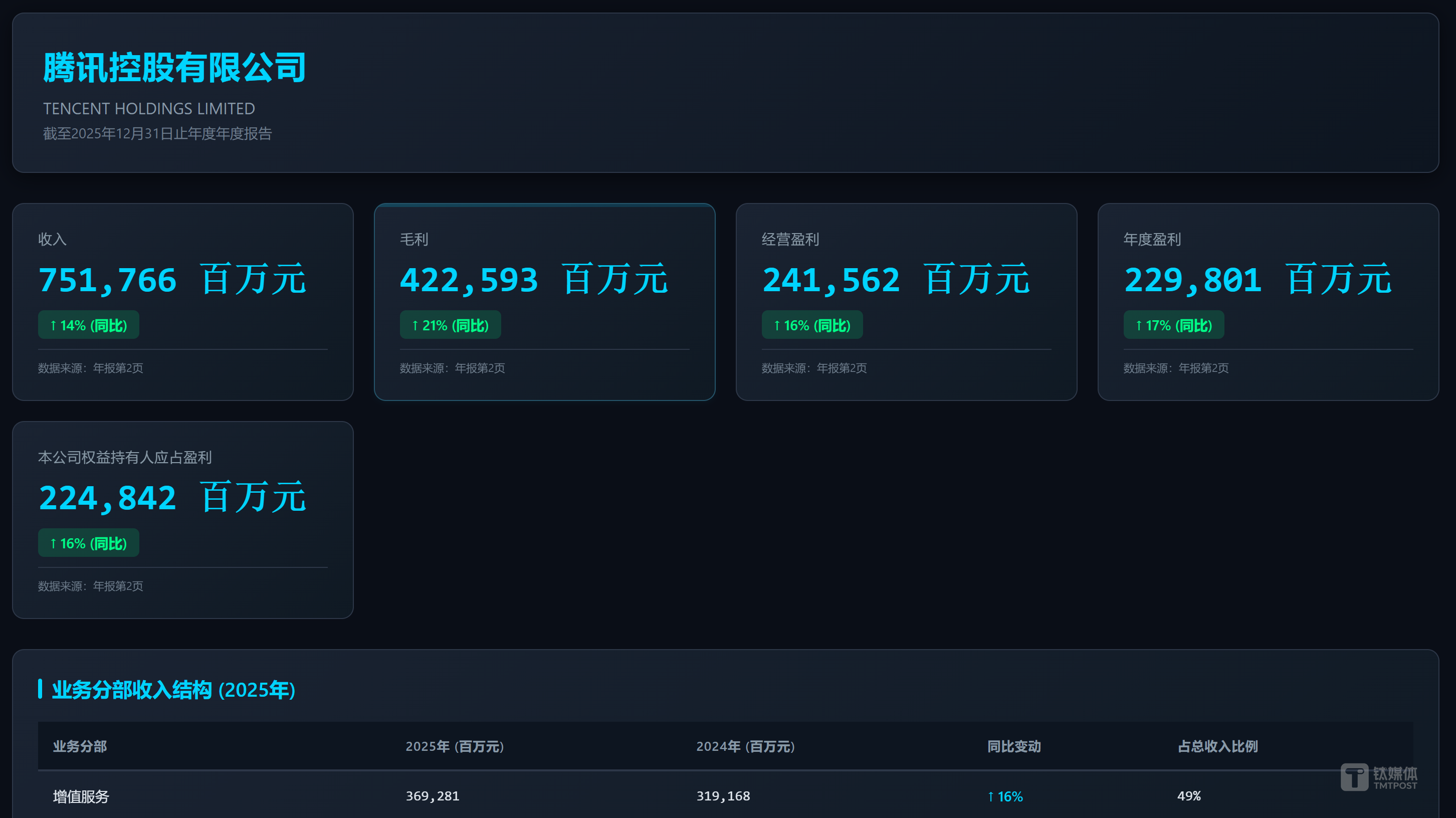 将附件的腾讯2025年年度财务报告PDF转化为一个深色主题HTML动态仪表盘,具体要求如下:
