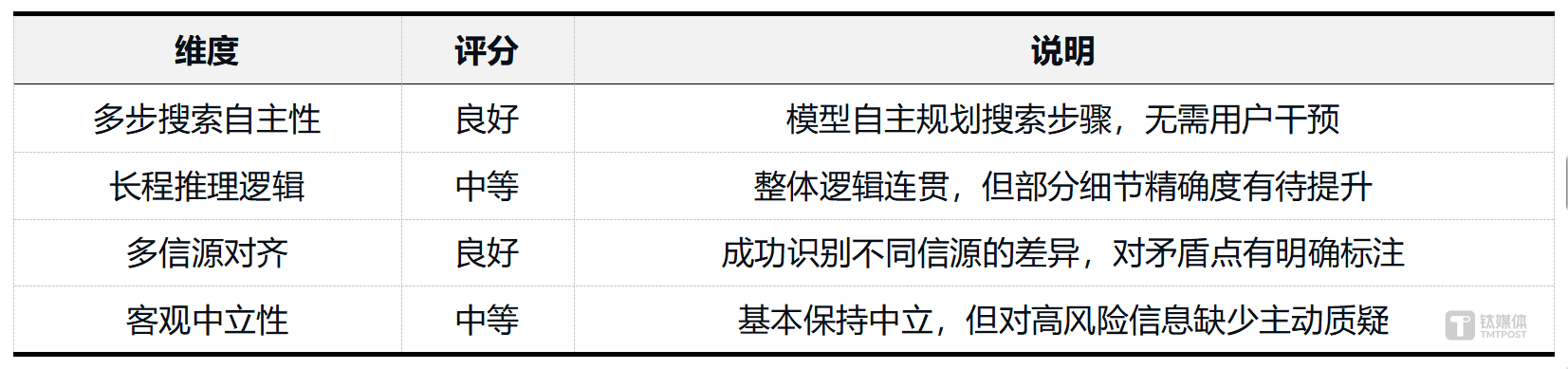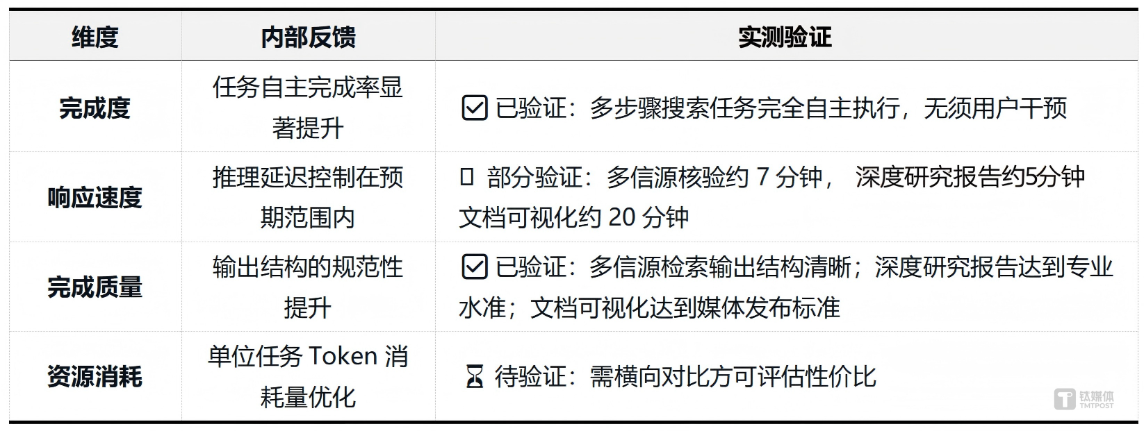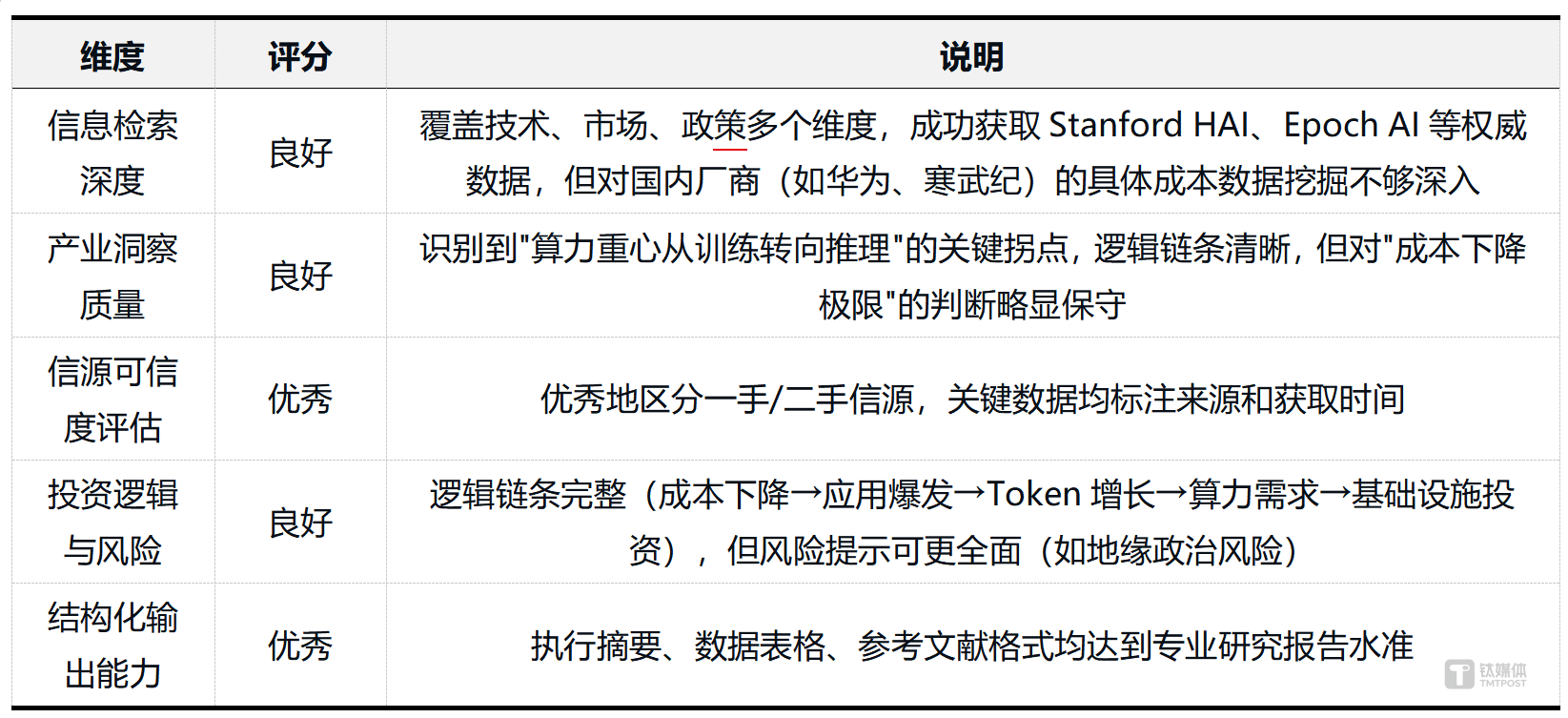 结论:模型在深度研究的框架搭建、信源检索与标注、结构化输出上表现优秀,能够生成符合专业标准的研究报告。但在产业洞察的深度(如对中国AI芯片厂商的具体分析)、风险提示的全面性上仍有提升空间。