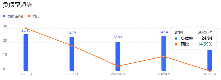 即便业绩承压,公司财务基本面仍相对稳健。截至2025年末,公司资产负债率24.94%,处于行业较低水平;短期借款从6亿元下降至3.97亿元,偿债压力较小;经营活动现金流净额2.81亿元,虽同比小幅下滑5.23%,但明显高于净利润;财务费用-1585.34万元,持续保持净收益状态。