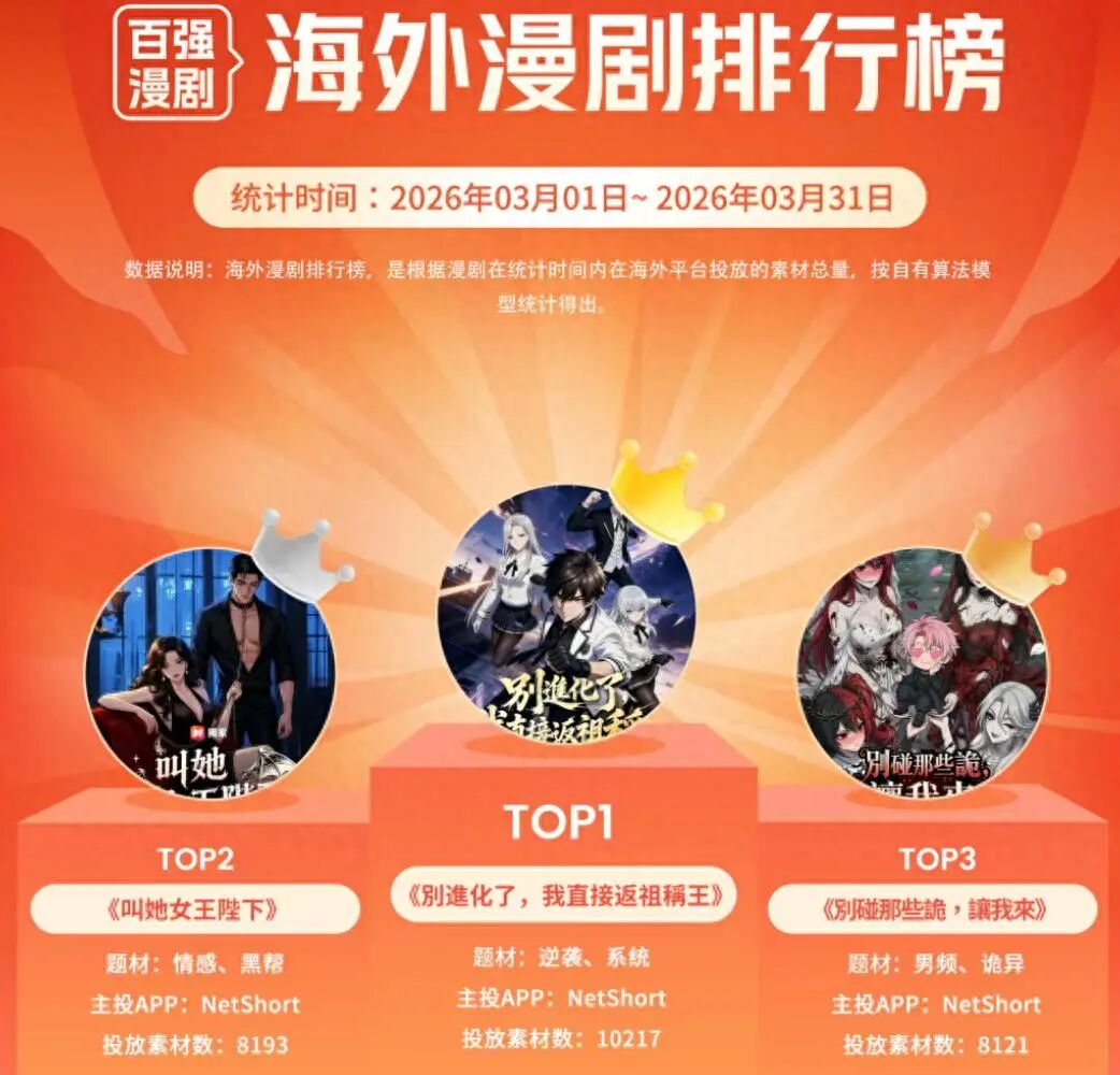 DataEye 2025年海外微短剧行业报告显示,海外本土短剧月产量仍不足200部,供给严重依赖进口,其中国产翻译剧占比高达80%—90%。到了AI漫剧时代,2026年3月,海外漫剧百强榜中,TOP3均由我国短剧出海企业NetShort包揽。