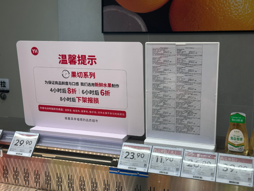 胖改后的永辉门店,像胖东来一样放上了果切到期打折下架的提示。摄影:李丹