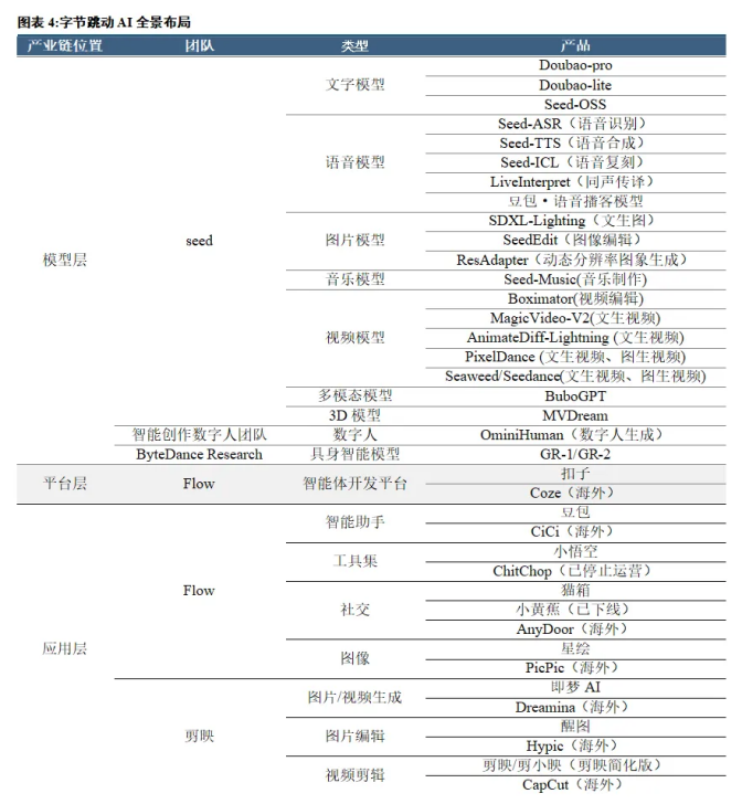众所周知,AI是未来的大趋势,也是重要的产业发展机遇。据中信建投数据显示,如今字节跳动的AI布局已经涵盖模型层、平台层和应用层三个层面,产品类型除涵盖文字、语言、图片、智能助手等常见类目,还涵盖数字人、具身智能、3D模型等细分类目。