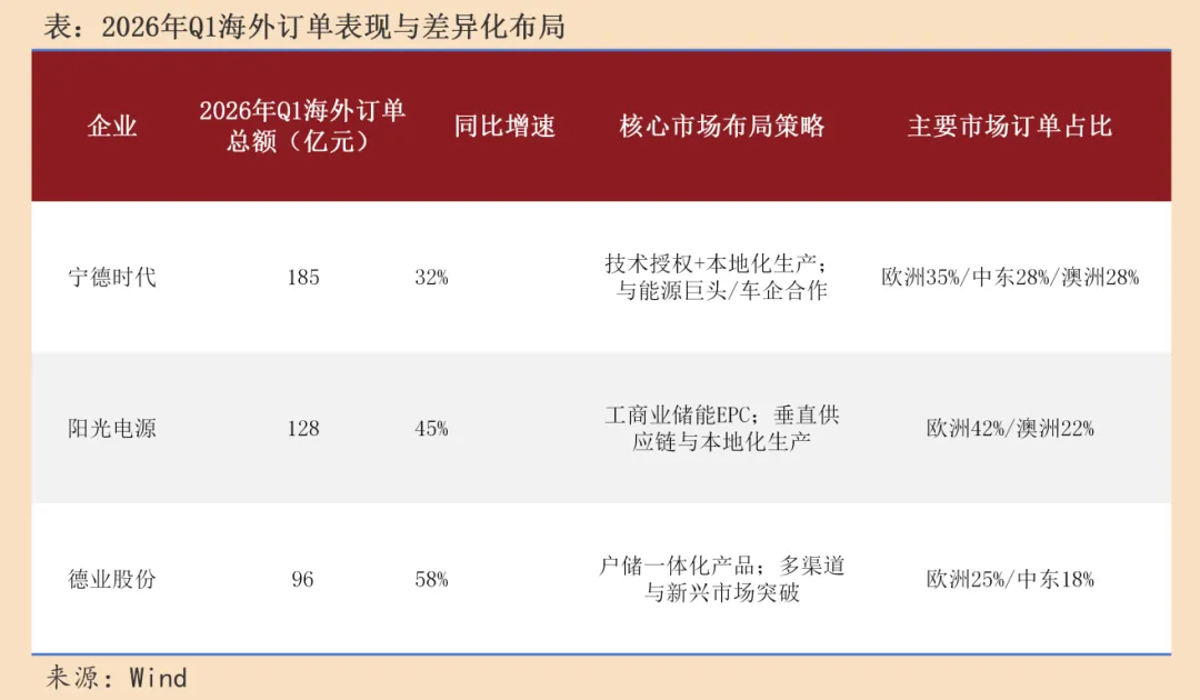 从一季度海外订单看,各家策略差异明显:宁德时代聚焦欧洲和中东的大型项目,阳光电源在工商业储能和EPC领域增速最快,德业股份靠户储在新兴市场实现了58%的订单增长。每家都在用自己的方式找空间。