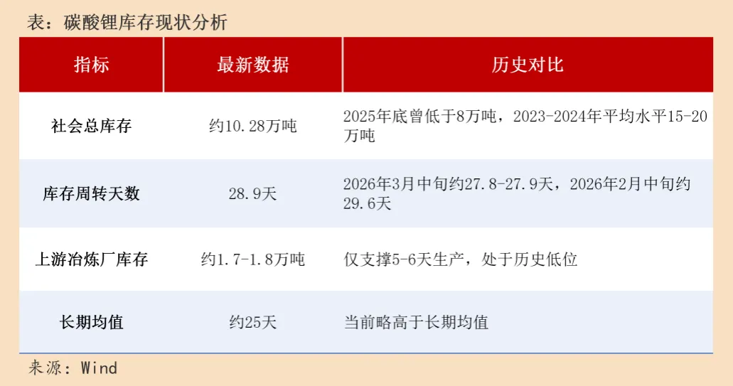 数据显示,截至4月中旬,中国碳酸锂社会总库存约10.28万吨,库存周转天数回升至28.9天,结束半年去库周期,进入温和累库阶段。但累库主要集中于贸易商环节,上游冶炼厂库存仅能支撑5-6天生产,仍处历史低位。全产业链“低水位”运行,下游补库意愿受价格博弈抑制,供需呈现紧平衡拉扯格局,实际价格压制有限。