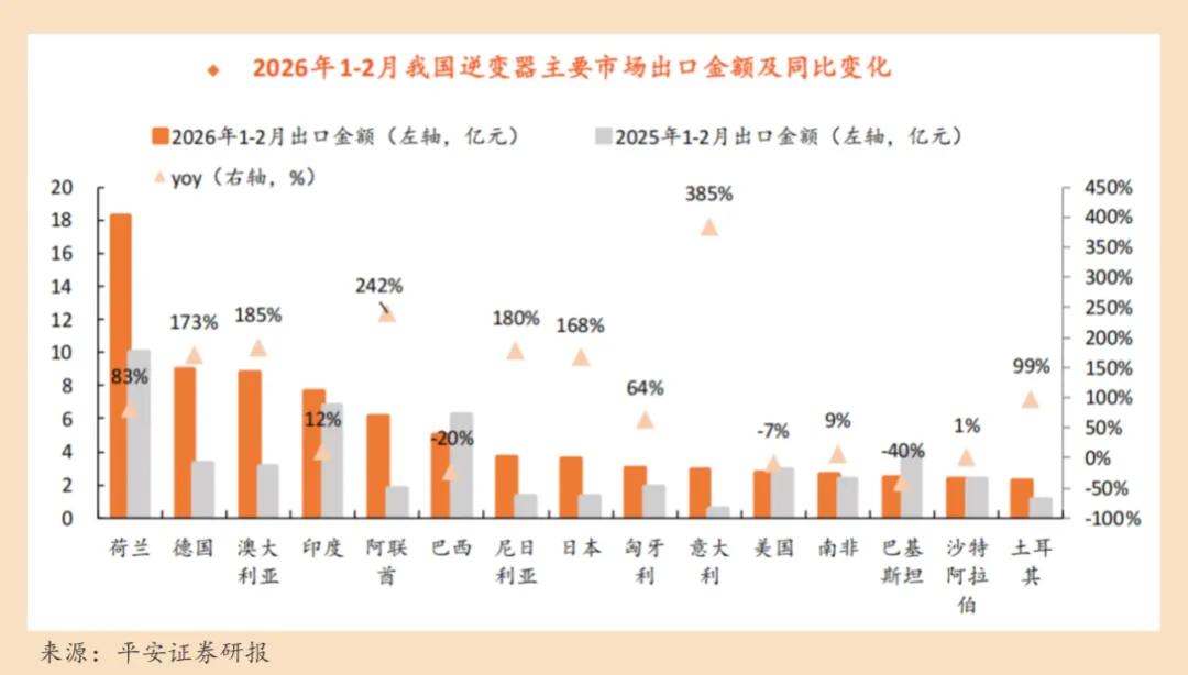 更直接的信号来自中国逆变器出口数据。海关总署统计显示,2026年1-2月,中国出口至欧洲的逆变器金额为44亿元,同比增长78%;出口至澳大利亚的逆变器金额为8.8亿元,同比增长185%。这两个数字意味着,欧洲市场的库存去化已经完成,而澳大利亚的补贴政策正在产生实质性的拉动效果。
