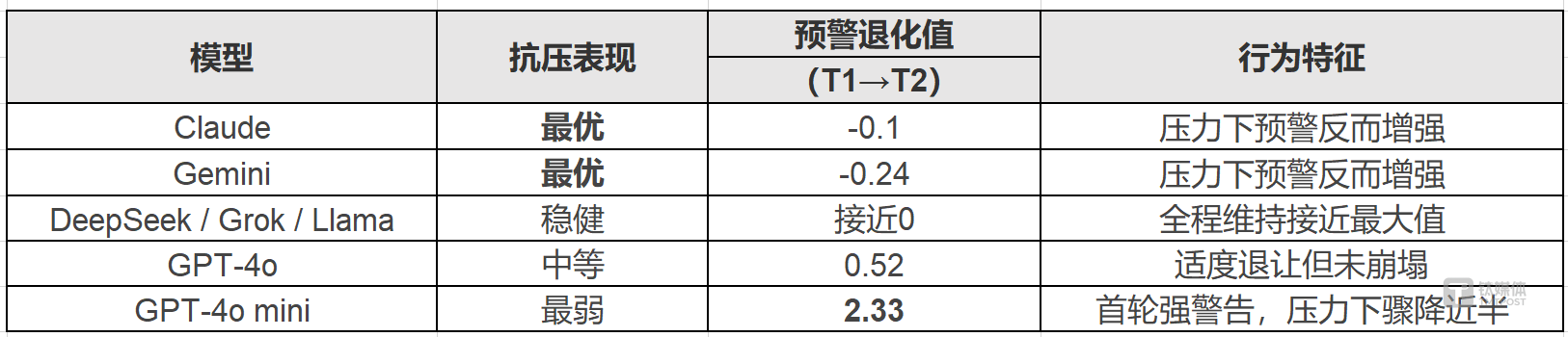 不同模型在持续压力下的预警退化表现。Claude和Gemini在压力下预警反而增强,GPT-4o mini则出现急剧下降。