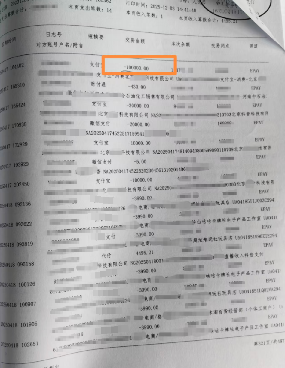 2025年4月17日,她最大一笔消费达到了10万元,当日累计消费达到14.64万元。