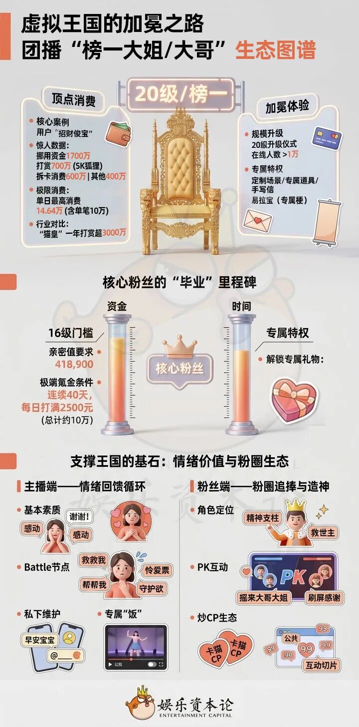 升级仪式,是主播提供情绪价值最隆重的一种方式,最早由YY直播在2012年首创,随后普及到所有的直播平台。团播里,粉丝升级16级灯牌和20级灯牌的时候,会得到专属升级仪式。主播会在一场直播中设计仪式环节,让所有粉丝共同见证、参与。