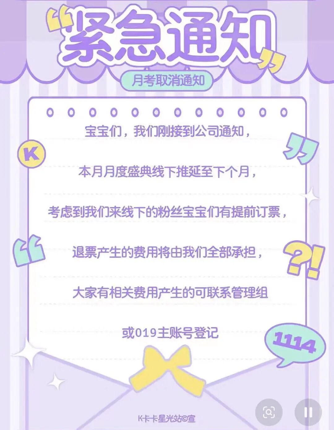 目前,SK(帅酷网络)已紧急通知各主播粉丝,表示本月末线下举行的SK月度盛典(即月考)将延期至下个月。