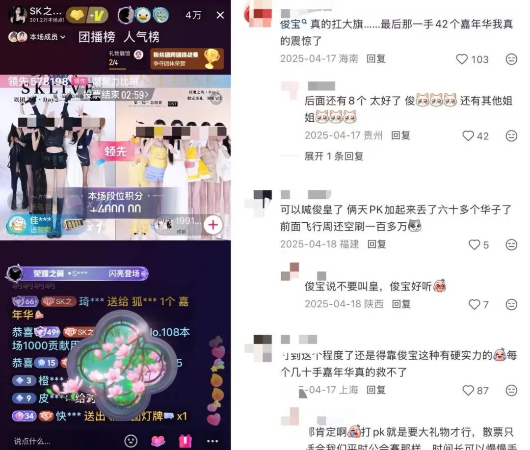据一位SK公会的粉丝透露,这一天是SK公会的团战PK直播,“非常难忘”。狐狸所在的SK017团,以落后100万票的劣势开局,随后在大哥大姐们的“嘉年华雨”里反超。