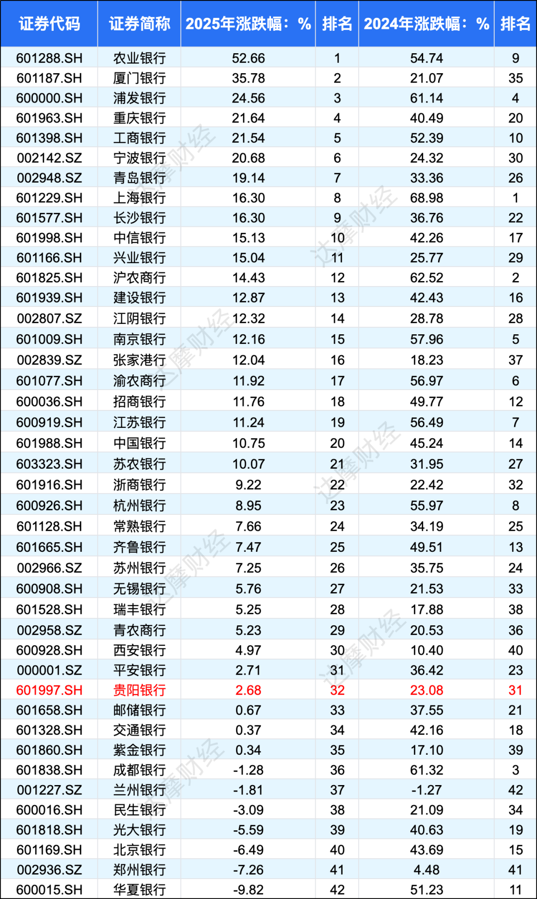 贵阳银行近两年在资本市场中存在感较低,2024年和2025年,贵阳银行的股价涨幅均排在30名开外。