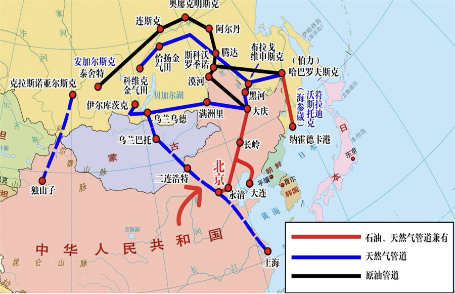 在东北方向,中-俄“西伯利亚力量”天然气管道于2019年投产、2024年全线贯通;西北方向,中国—中亚天然气管道三线开通;西南方向,中缅油气管道2013年正式通气、2017年正式通油;中国从中东地区进口油气,既可以走马六甲海峡的海上运输,也可避开马六甲海峡,从缅甸经陆路直接输送到中国。