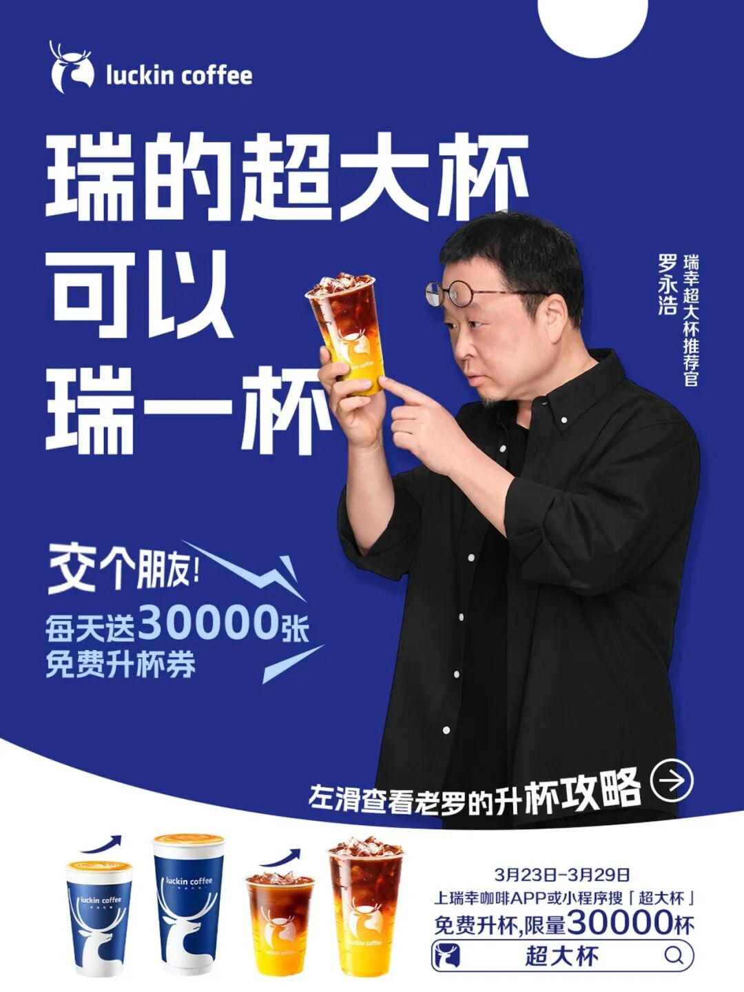 瑞幸官宣罗永浩成为超大杯推荐官。(图源:瑞幸官方微博)