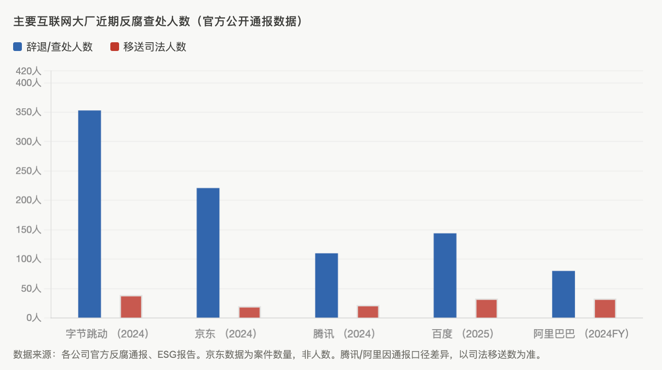 从司法移送比例来看,百度2025年移送了33人,占当年查处总数的23%:每查处约4人,就有1人触及刑事红线。美团在2022年移送了107人,其中约有60人是外部合作商。这一数字的特殊性在于,美团的业务重线下、重供应链,贪腐往往不是员工单干,而是内外勾结。