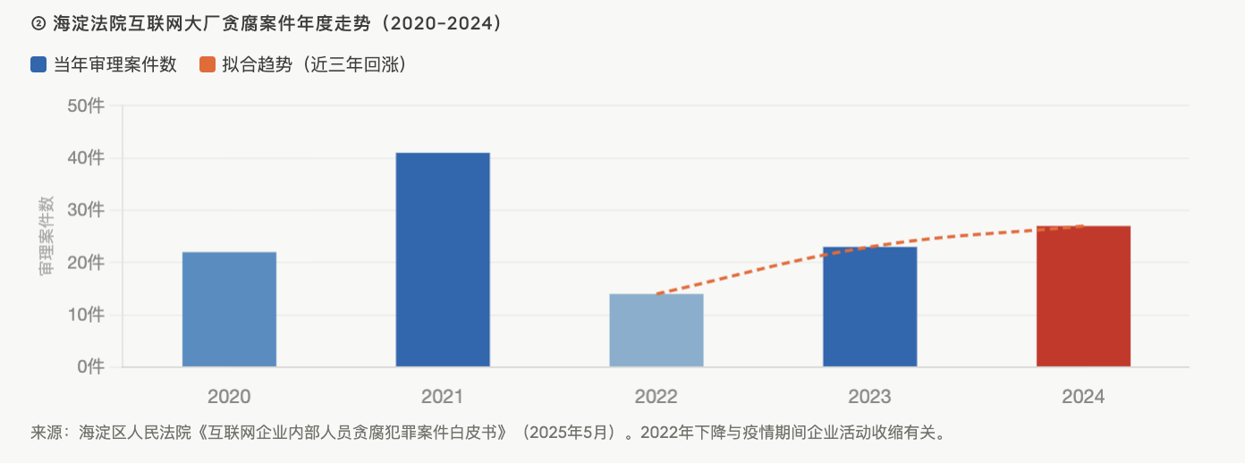 北京海淀区人民法院2025年5月发布的《互联网企业内部人员贪腐犯罪案件白皮书》显示,仅这一个法院,2020年至2024年就审理了涉互联网企业内部人员贪腐犯罪案件127件,涉案金额超3亿元。七成以上,发生在互联网大厂。
