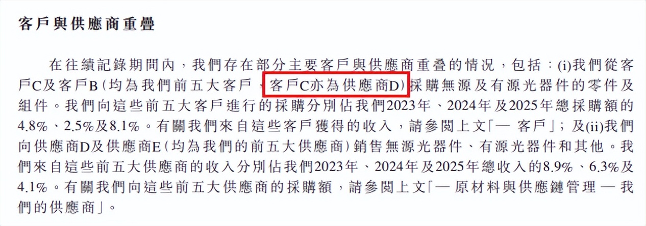 一个被标注为“客户C”与“供应商D”的同一主体,天孚通信向其采购的零组件金额在2023年、2024年还只有3500多万元,2025年猛增至1.87亿元,占全年总采购额的7.8%。