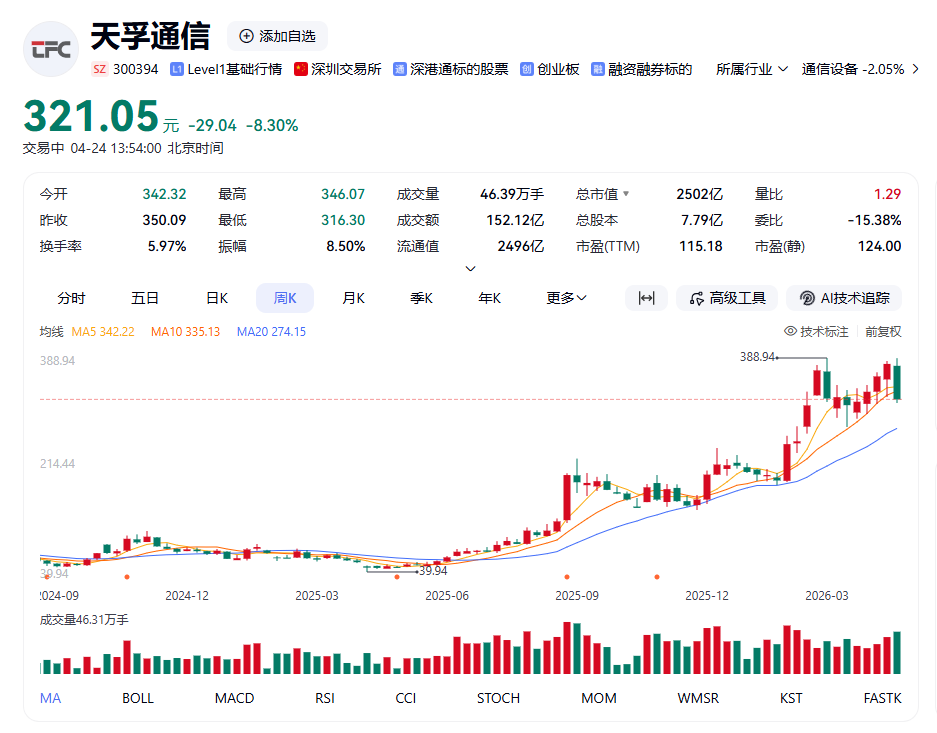 天孚通信的A股价格从2025年初的约64元一路攀升至2026年3月的388元以上,市值一度逼近2800亿元,在A股“易中天”(新易盛、中际旭创、天孚通信)阵营中被视为“弹性最大”的一极。