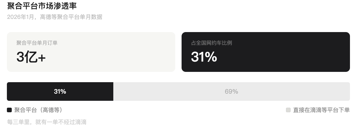 过去十年,滴滴靠海量司机和调度系统在打车市场站稳了脚跟。这一切的前提是:用户想打车,就得打开滴滴。今天聚合平台已经在分流:2026年1月,高德等聚合平台单月订单首次突破3亿,占全国总量的31%,每三单里就有一单不是直接在滴滴下的。AI助手的加入,加剧了这个趋势。
