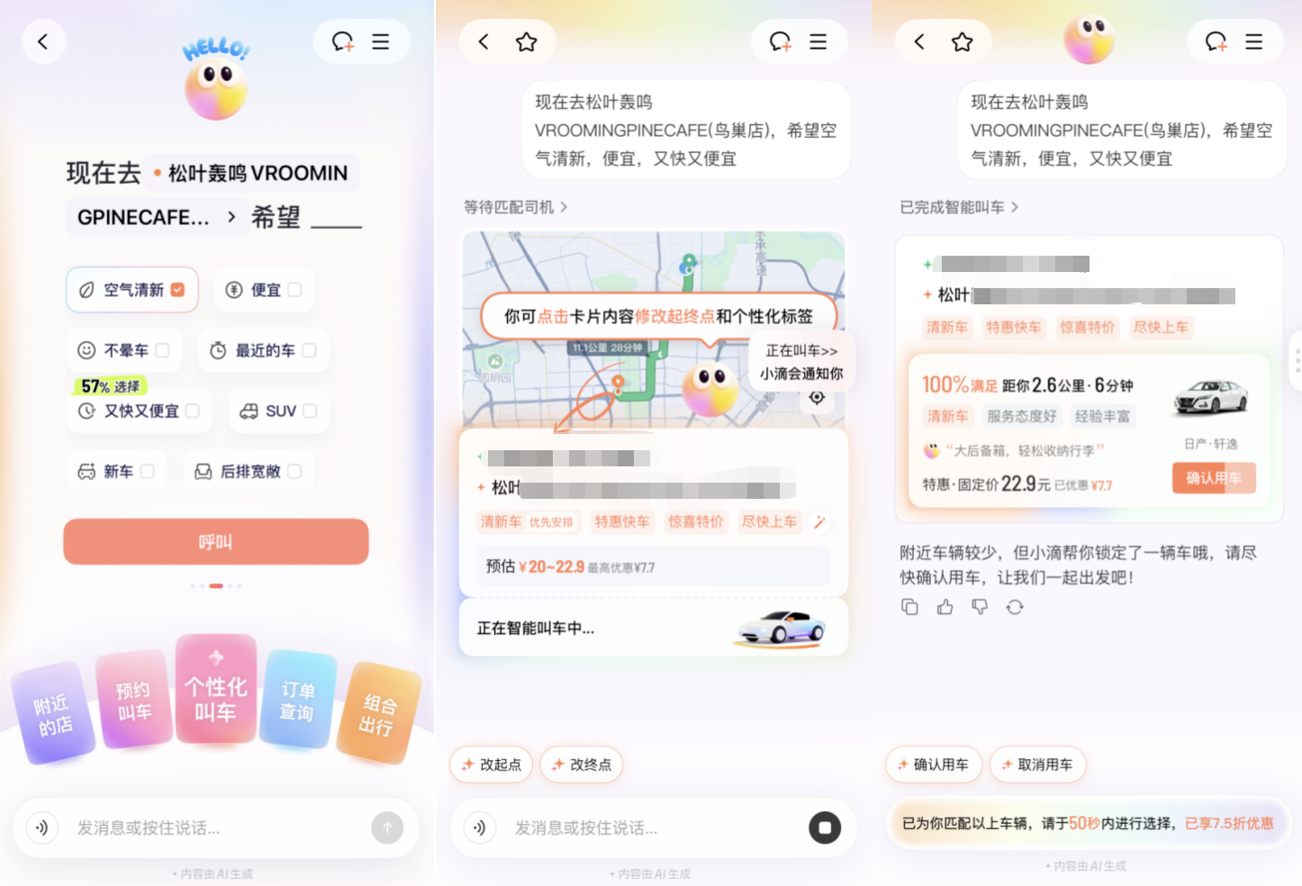 需求简单的时候,直接去某个地址、不挑车,点一下App就能搞定,绕一圈说给AI听反而多了步骤。需求复杂的时候,比如要选特定车型、加途经点、说明特殊情况,AI理解了意图,但最后往往还是要在界面上确认勾选,中间那些步骤并没有被真正省掉。