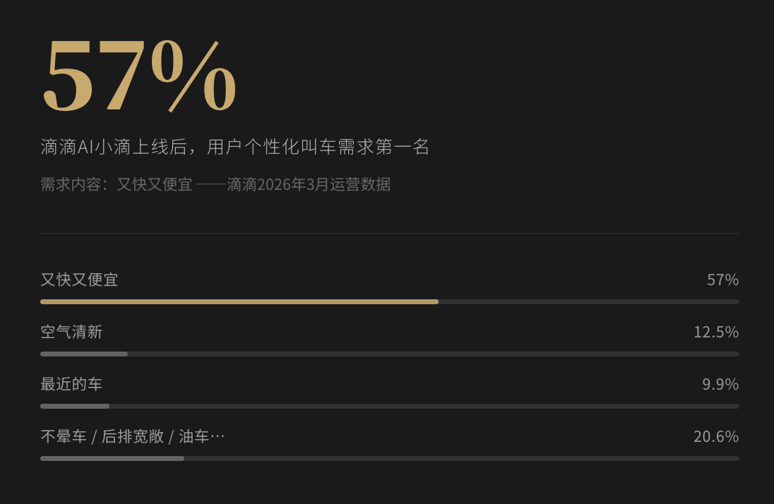 滴滴的AI打车产品“小滴”上线后,公布了用户的个性化叫车需求分布,排第一的是"又快又便宜",占57%。