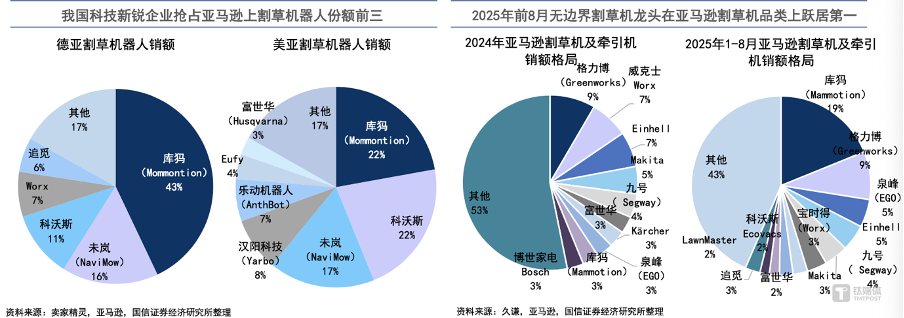 从市场来看,第一类的新锐庭院机器人品牌有较为明显的先发优势。根据国信证券对2025年前8月亚马逊(德国+美国站点)销售统计,库犸科技获得了最多的市场份额,在德国亚马逊占比高达43%。