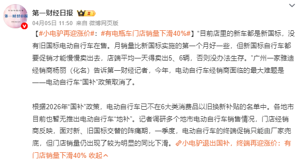 然而,政策红利来得快去得也快。根据国家发展改革委、财政部印发的《2026年大规模设备更新和消费品以旧换新政策通知》,电动自行车已被移出补贴清单,各地也暂未推出配套“地补”。这意味着,消费者在2025年还能享受的数百元购车补贴,在2026年彻底消失。