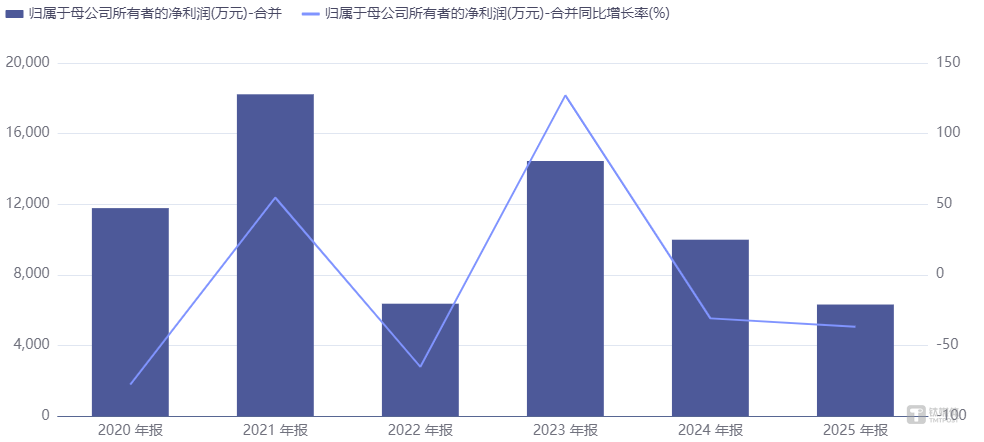 然而,盈利端的表现却与营收增长形成鲜明反差。2025年公司归母净利润6316.20万元,同比下降36.77%;扣非归母净利润更是仅为1647.14万元,同比大幅下滑85.47%。这已是公司净利润连续第二年下滑,2024年归母净利润同比降幅为30.86%。