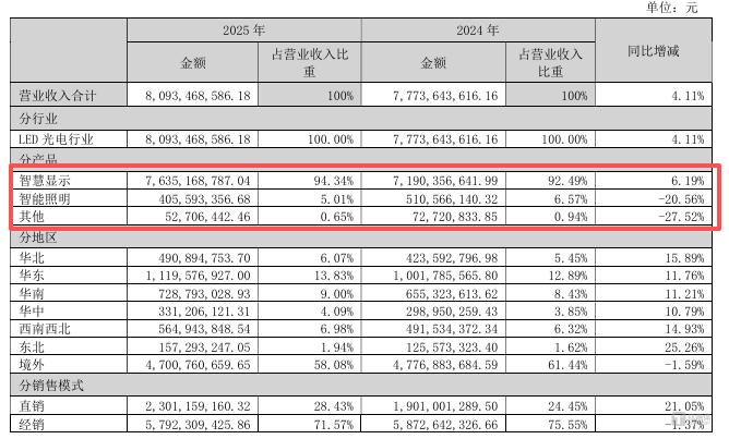 分产品看,两大核心业务毛利率均出现明显下滑:智能照明业务毛利率25.65%,同比下滑3.09%;智慧显示业务毛利率26.51%,同比下滑5.25%。值得注意的是,智慧显示作为公司核心优势业务,毛利率下滑幅度更大,反映出该领域竞争加剧、产品价格压力上升的行业趋势。