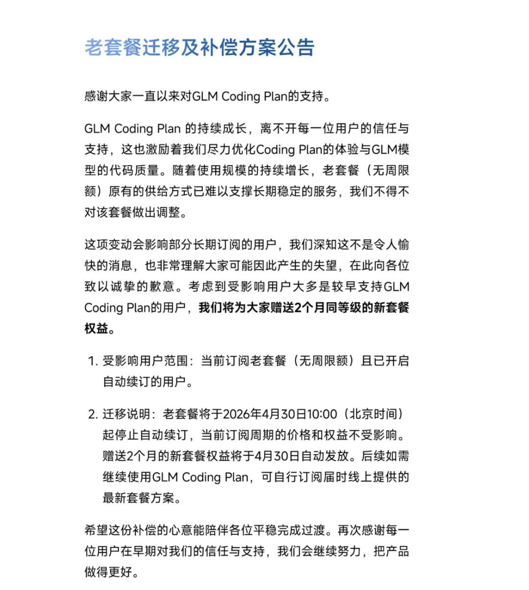 智谱的应对轨迹,清晰展示了这个矛盾从可控走向失控的过程。GLM Coding Plan的无周限额老套餐宣布于4月30日停止自动续订,平台公告中承认:随着使用规模的持续增长,老套餐原有的供给方式已难以支撑长期稳定的服务。并为受影响的早期订阅用户赠送了两个月的新套餐权益。