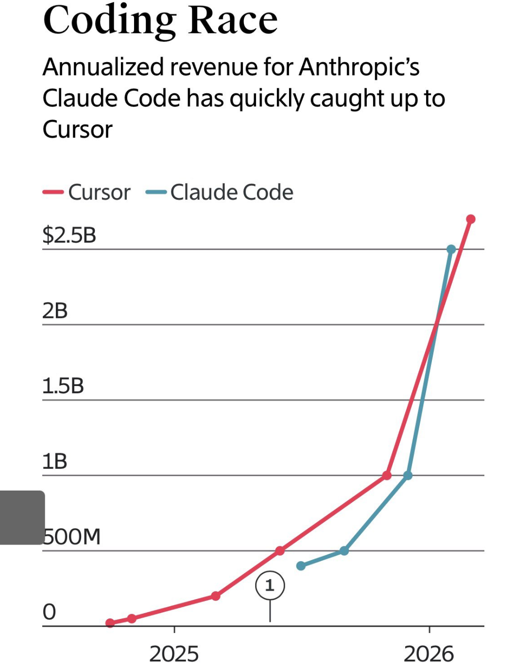而这轮“Coding热”的始作俑者Anthropic,让这个判断从理论变成了可以被资本定价的事实。Claude Code去年5月才正式上线,到2026年2月ARR已达25亿美元,增速超过了Salesforce和Slack的早期阶段,也在不到一年内超越了Cursor花两年多才达到的收入规模。