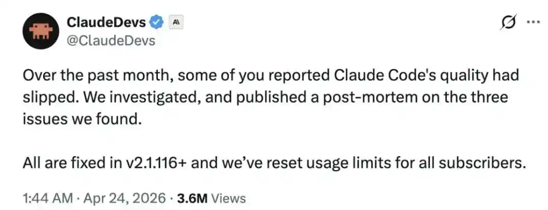 这个说法可以信。但从商业叙事的角度看,另一半同样真实:Anthropic 等了六周才公开承认 Claude Code 在退化,等到 OpenAI 要放新牌的那一天才把问题端出来。如果不是同行压力足够大,如果不是 Opus 4.7 已经证明了“我们还有后手”,这份声明可能永远都不会到来。