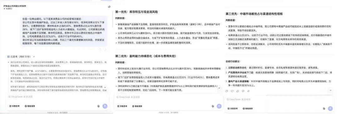 深度思考响应用时9秒。V4在思考过程中先完成了问题拆解:将所有负面信号归类为现金流威胁、盈利能力恶化、市场结构性风险三个维度,再依据“若不立即处理会导致现金流断裂或持续亏损”的紧迫性标准完成排序,逻辑链条清晰可见。