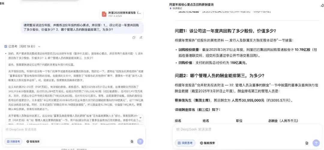 我们的测试问题分两层:第一层要求提炼年报核心要点;第二层追问两个藏在文档深处的具体数据——该年度回购股份的总数量与总对价,以及管理人员酬金排名第三的具体人员与金额。这两个问题的答案分别散落在年报第212至213页和第311至313页,位置偏后,必须完整阅读文档才能准确定位。