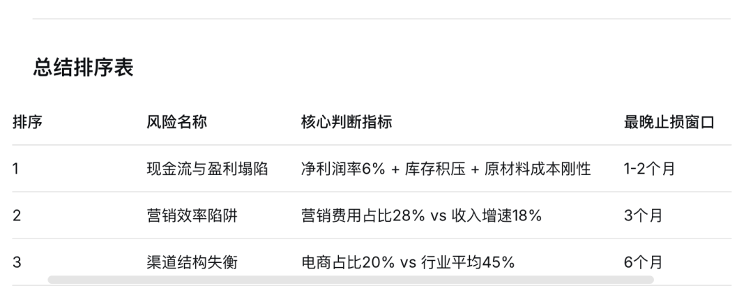 最终它给出的三个优先风险依次是:库存积压与现金流风险排第一; 盈利能力持续恶化排第二,中端市场被抢占与渠道结构性短板排第三,并均给出了充分理由。