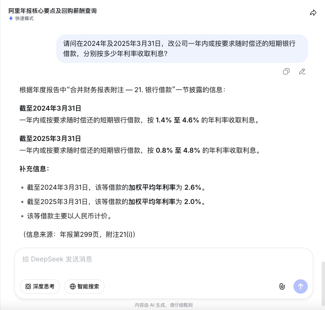从整体表现来看,快速模式下V4对这份300余页年报的处理相当稳定。数据定位准确、跨章节关联清晰、单位换算无误,且在回答过程中主动识别了潜在的口径歧义并加以说明,并没有因为文档体量大而出现答非所问或信息遗漏的情况。