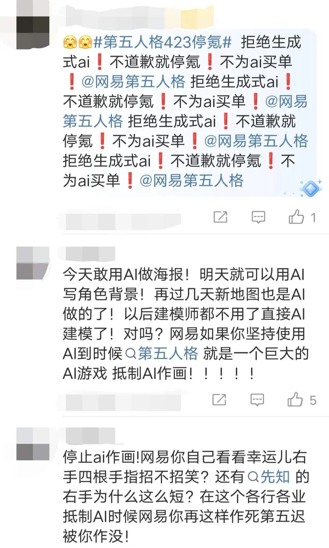 愤怒的玩家在《第五人格》官方微博账号下留言,要求游戏“停止使用AI”“停止试探”“重新画海报”,“拒绝生成式AI,不道歉就停氪,不为AI买单”。一些玩家选择在4月23日停止为游戏付费,这一天是“画家”角色艾格·瓦尔登的生日。角色的画笔能将美好留住,他们也希望得到来自官方的声明和道歉,换回人类画笔对游戏创作的主宰。