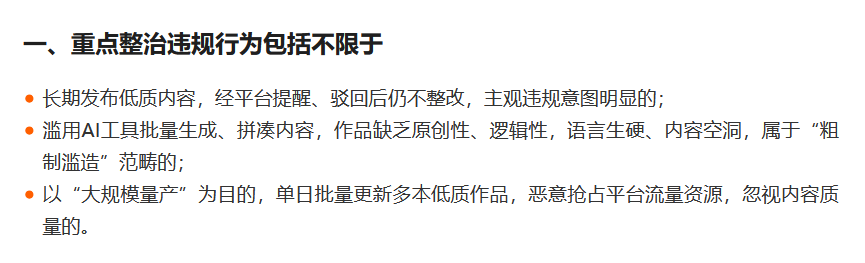 2026年2月4日,番茄小说发布公告称,启动专项整治行动,重点打击大规模量产低质内容的违规行为,包括“滥用AI工具批量生成、拼凑内容,作品缺乏原创性、逻辑性,语言生硬、内容空洞,‘粗制滥造’”,以及“以‘大规模量产’为目的,单日批量更新多本低质作品,恶意抢占平台流量资源,忽视内容质量”等行为。
